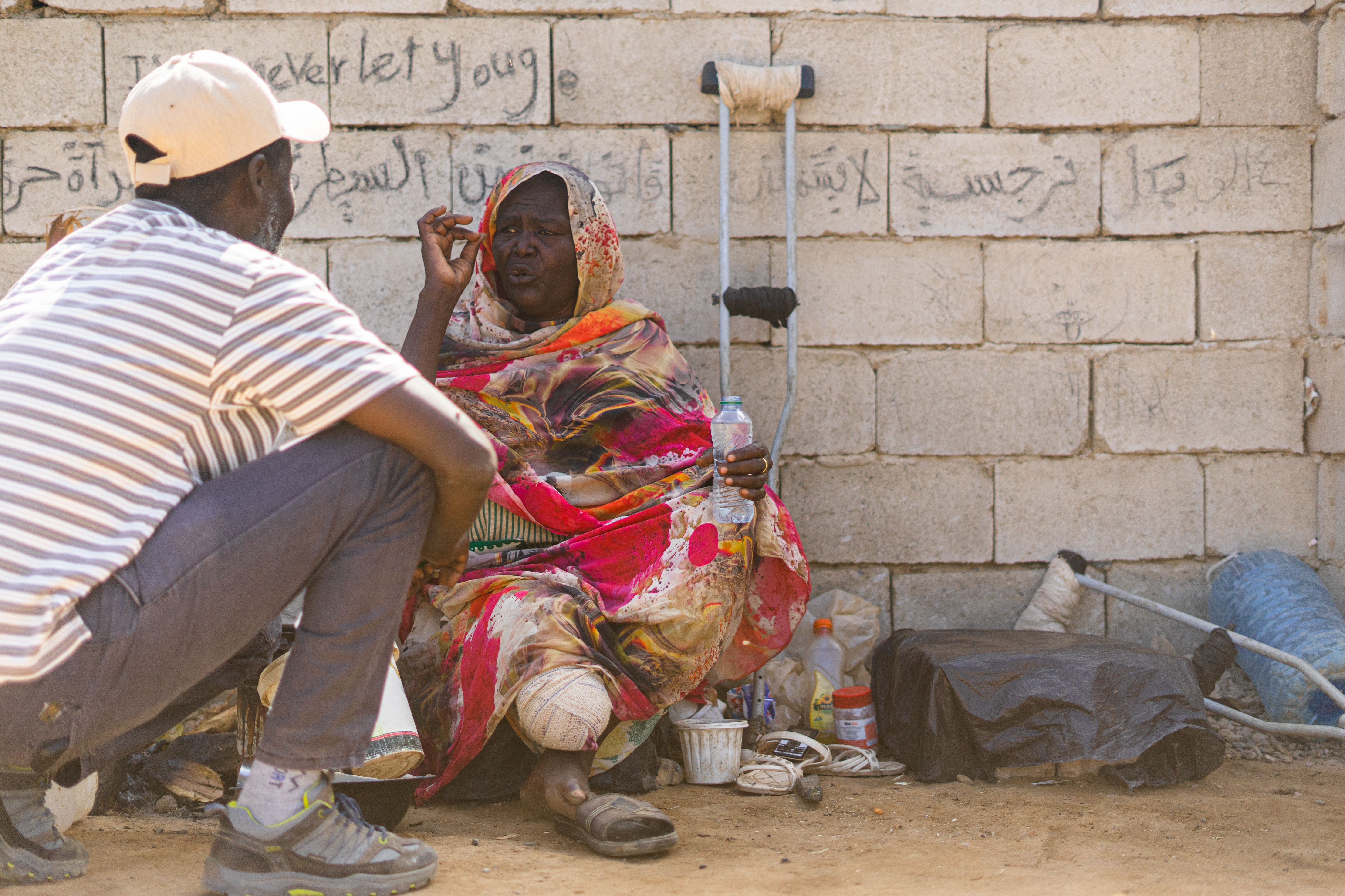 One day, while Samia was at the market, her daughter rushed in with urgent news: some relatives were preparing to flee on a large truck. The reality of displacement hit her instantly. Her daughter hurried home to gather their belongings while Samia, leaning on her cane, set out to negotiate with the truck driver.