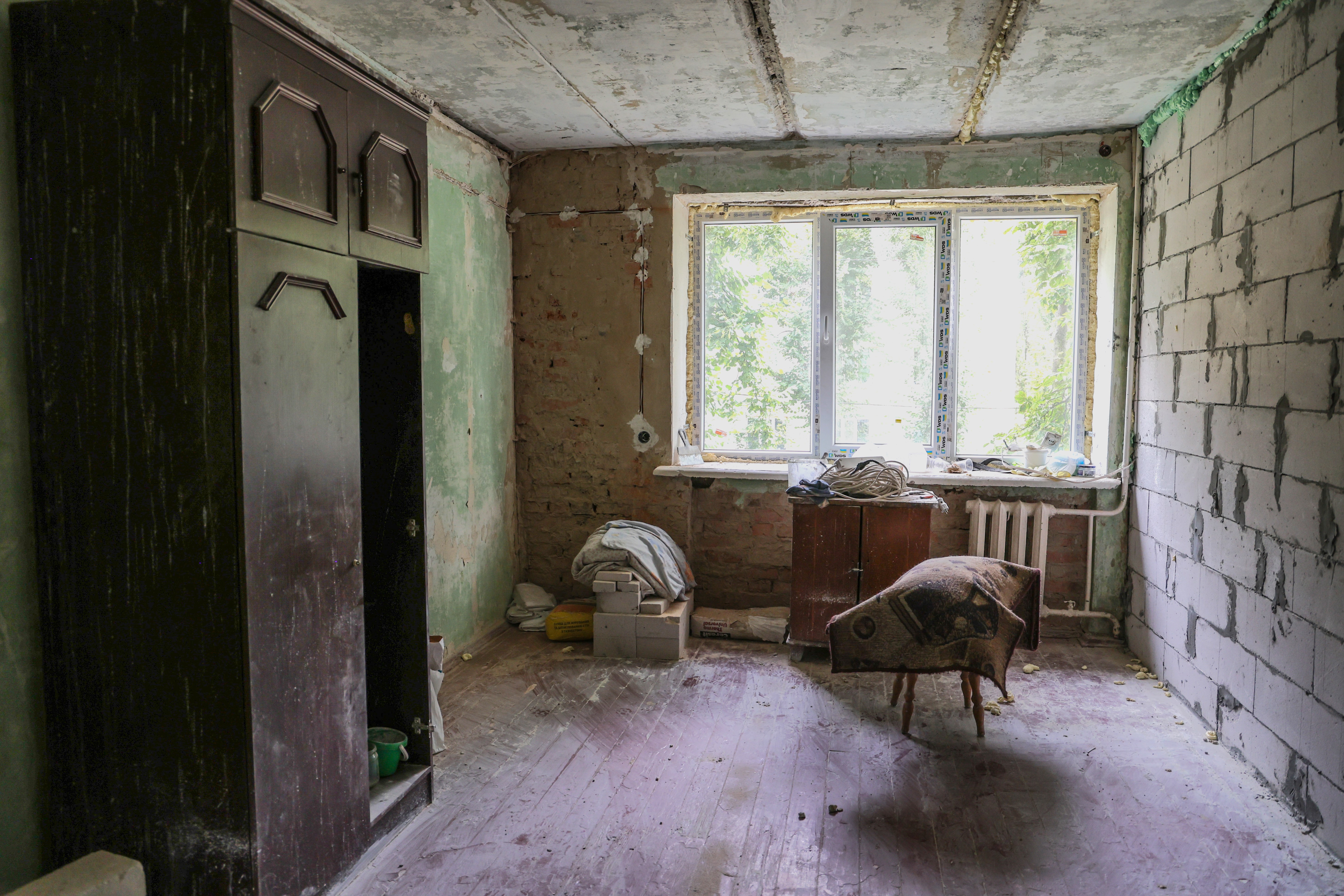 Natalia* and her daughter Alina* live in a 10-square-meter room in a dormitory in Chernihiv, a city in Northern Ukraine. This room does not belong to her—she rents it, paying only for utilities as the owner does not want to charge Natalia for rent. In Ukraine, after the collapse of the Soviet Union, dorm rooms were allowed to be privatised. Natalia owns one of them, another room of 15 square metres in a dormitory nearby. She was at home when a missile explosion hit back in March 2022 causing heavy damages. Only the walls are left, and everything has to be renovated.